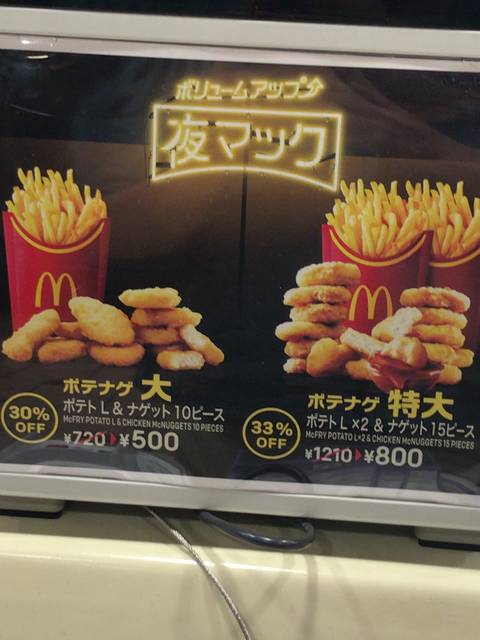 ポテナゲ大はマックフライポテトLサイズ&チキンマックナゲット10ピースが通常720円税込のところが30%OFFで500円税込となる。夜マックで買うことで220円のお得になる。