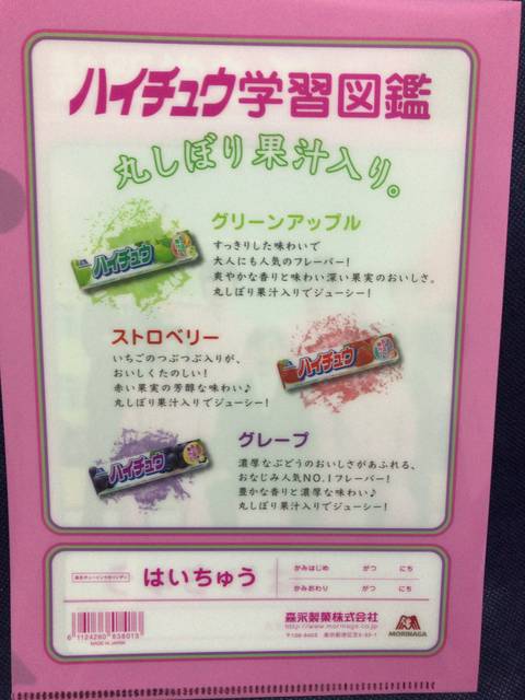 クリアファイルの裏にはハイチュウ学習図鑑として丸しぼり果汁入りのグリーンアップル、ストロベリー、グレープの商品説明が書かれている。グリーンアップルはすっきりとした味わい、ストロベリーはいちごのつぶつぶ入り、グレープは濃厚なぶどうの美味しさで人気NO1、どの味も丸しぼり果汁だからジューシーで美味しいという説明になっている。クリアファイルの下の方には噛み始めが何月何日か、噛み終わりが何月何日か書くようなデザインで、更に森永製菓株式会社の住所も書いてあるのが面白い。