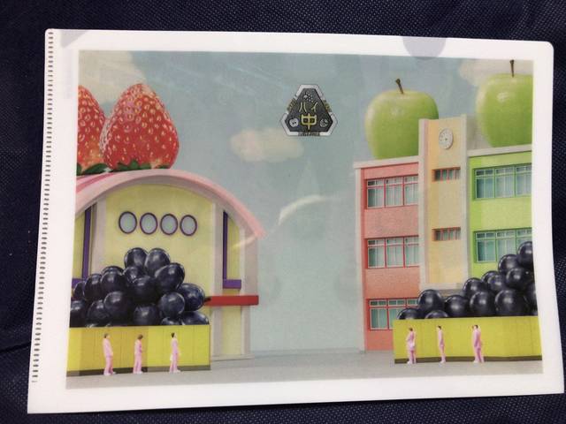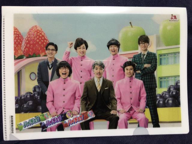 クリアファイルは各店先着30名分が用意されている。クリアファイルは全2種でA5サイズ。1枚目のクリアファイルはハイチュウに描かれているストロベリー、グリーンアップル、グレープの絵を背景に校舎や体育館が描かれた中学校にいるようだ。なぜ中学校かと言うと関ジャニ∞メンバーが着ている制服のボタンがハイチュウにかけてハイ中と書かれており、先生と生徒に扮した関ジャニ∞メンバーが記念写真を撮っているからだ。