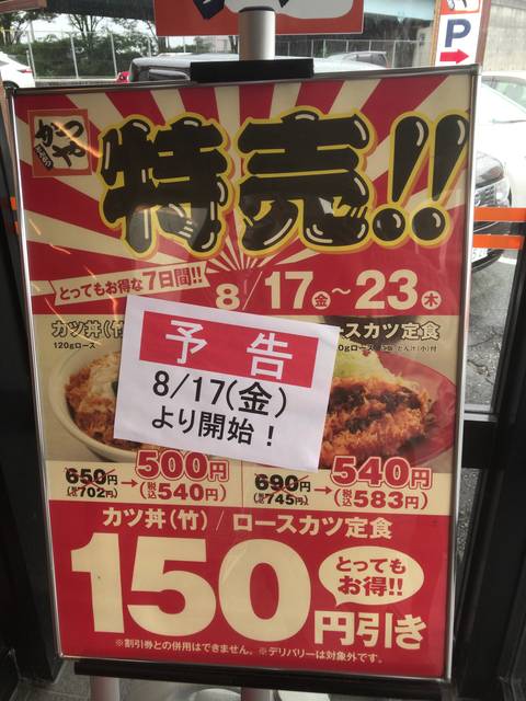 ・特売対象メニューはカツ丼(竹)とロースカツ定食で150円引き