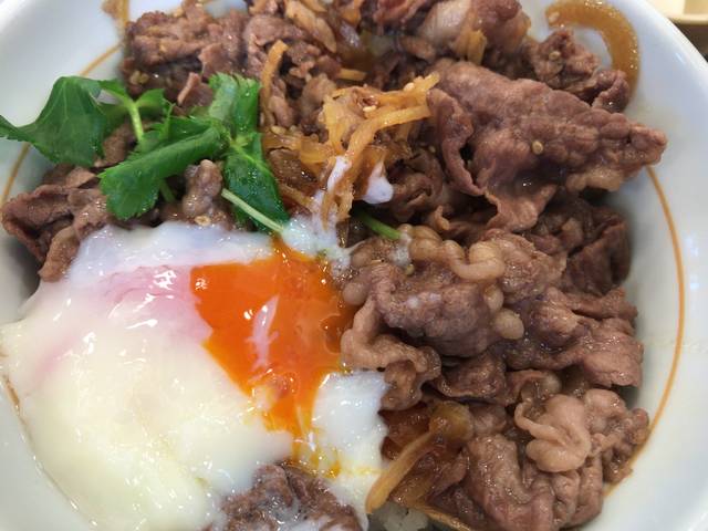 柔らかい肉質の黒毛和牛に醤油ベースでコクのあるタレをかけたなか卯の贅沢な丼。タレは甘味とまろやかな黒みりんを使っており、黒毛和牛肉と相性が合っている。生姜の香りが食欲をそそり、こだわり温たまも付いている。