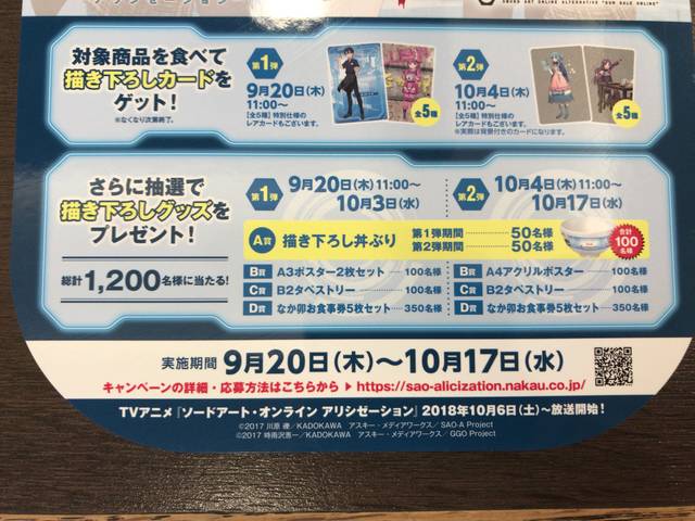 SAOの描き下ろしカードはなか卯全店の対象商品を注文すると、1枚プレゼントされる。描き下ろしカードは第1弾が全5種類で配布期間は2018年9月20日(木)~10月3日(水)、第2弾も全5種類で配布期間は2018年10月4日(木)~10月17日(水)。特別仕様のレアカードもあるようだ。カードはなくなり次第終了となる。SAOデザインの唐揚げとこだわり卵の無料券ももらった。