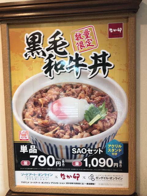他には先ほど紹介した黒毛和牛丼を食べて描き下ろしオリジナルアクリルスタンドのセット販売や、結城明日奈(CV.戸松遥)による店内放送、全国のなか卯18店舗を対象に店舗限定の等身大パネルの設置、ソードアート・オンライン(SAO)のラッピング店舗など様々なキャンペーンを実施している。等身大パネルは置かれる店舗が限定される上に店舗によってキャラクターが違うようだ。