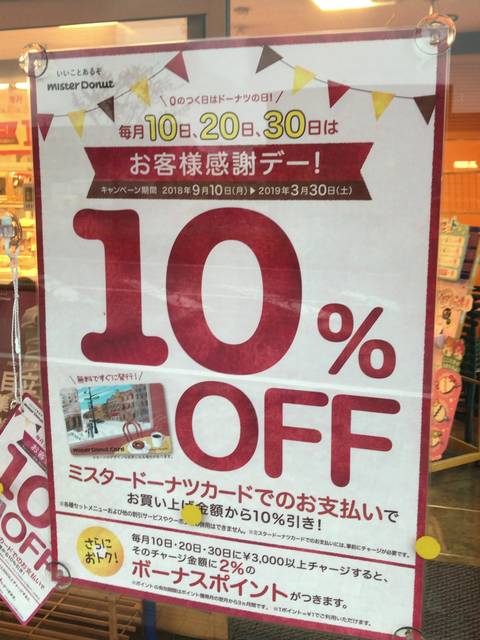 特典の3つ目は2018年9月10日(月)~2019年3月30日(土)の期間限定ではあるが、毎月0のつく日(毎月10日、20日、30日)に「お客様感謝デー!」でミスタードーナツカードでの支払いがお買い上げ金額から10%引きされるキャンペーンが実施されている。このようにミスタードーナツカードを利用するとお得な特典を受けることができる。