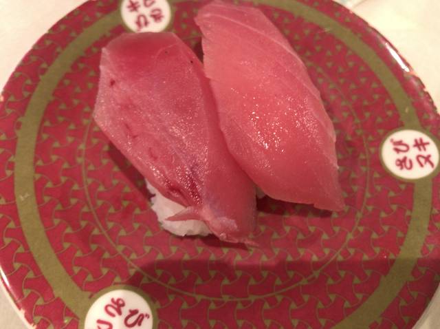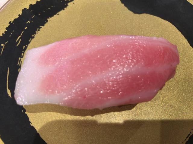 そして贅沢握りでは大トロや中トロが販売される。写真は大とろだが、脂身がすごい。味は尋常じゃないくらいの美味しさで回転寿司とは思えないほどだ。大トロは1皿1貫で150円(+税)だが、価格以上の価値がある一品だと思う。