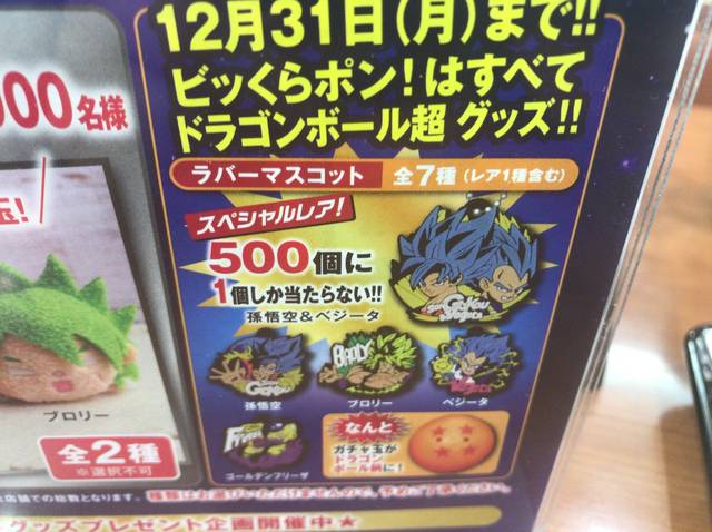 2018年11月22日(木)~12月31日(月)の期間でビッくらポン!の景品にドラゴンボール超グッズが登場している。くら寿司でしかもらえないオリジナルグッズだ。2018年12月14日(金)に映画「ドラゴンボール超ブロリー」が公開されるにあたり、各社キャンペーンを実施しているが、くら寿司でもキャンペーンを開始した。