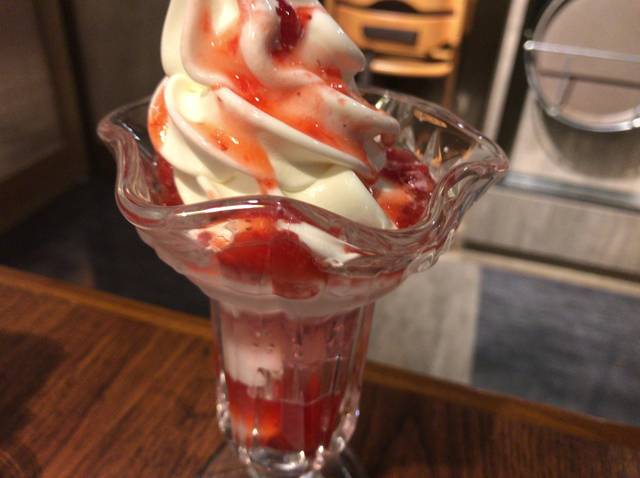 デザートのストロベリーソフトは北海道のソフトクリームが美味しい完熟いちごソースをかけたパフェ。白玉やゼリー、イチゴのコンポートが入っていて贅沢なパフェだ。つまりどのメニューも最高に美味しかった!
