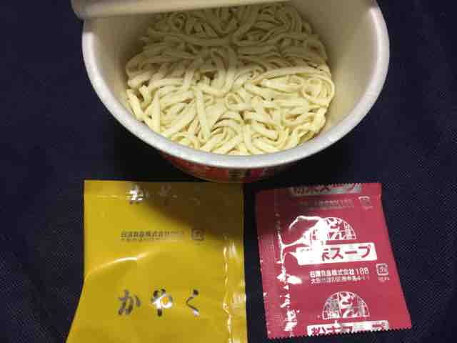 フタを開けるとうどん、液体スープ、かやくが入っている。