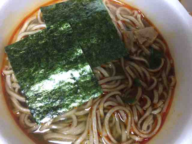 お湯を入れて待つこと5分。食べると、通常のどん兵衛のそば麺よりも太くて食べ応えがある。お湯を入れて混ぜるとすごく山椒の良い香りがする。そしてラー油の香りも心地よく、すごく辛いという訳ではなくピリ辛で、食べるのが進む。食べ終わるとそばを食べたという感じがする満足する商品だ。
