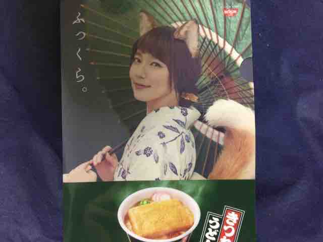 緑色のクリアファイルには吉岡里帆がきつねの格好で緑の傘をさしている。クリアファイルの下にはきつねうどんがこちらも湯気が出て美味しそうで、ふっくらという油揚げを食べたときの食感が表現されている。どちらのクリアファイルも横向きで振り向いたところを写されて構図がいいし、色も鮮やかですごくいい。