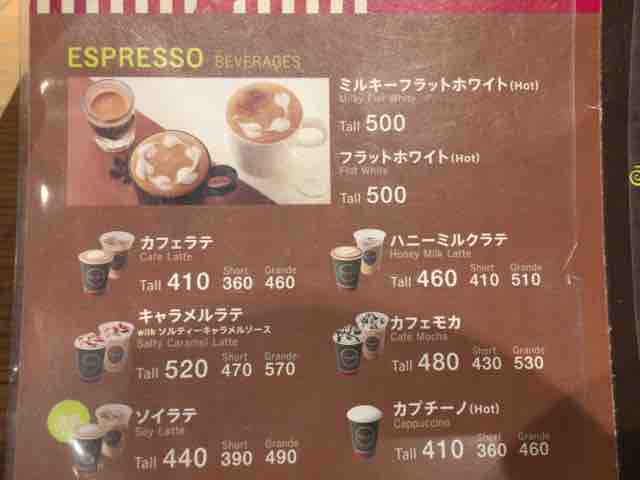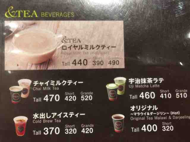 例えばチャイミルクティーのショートサイズは420円、宇治抹茶ラテのショートサイズは410円と400円以上する。