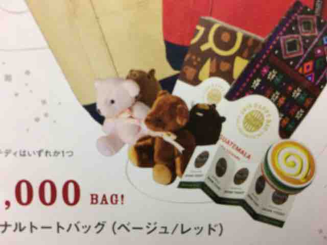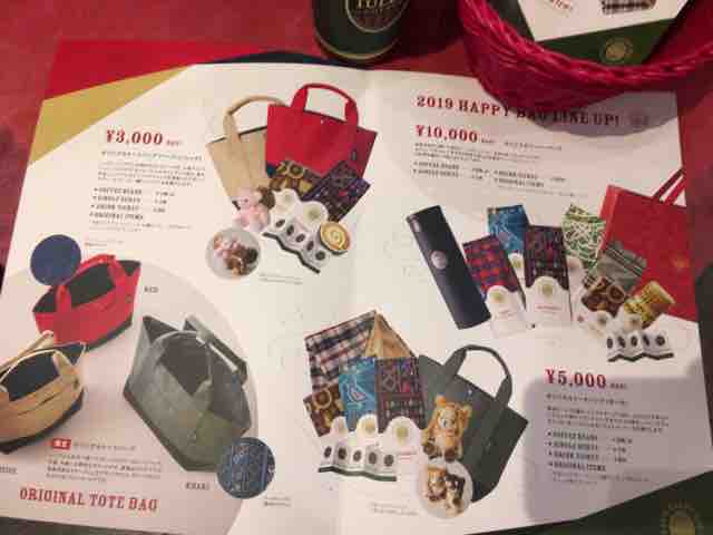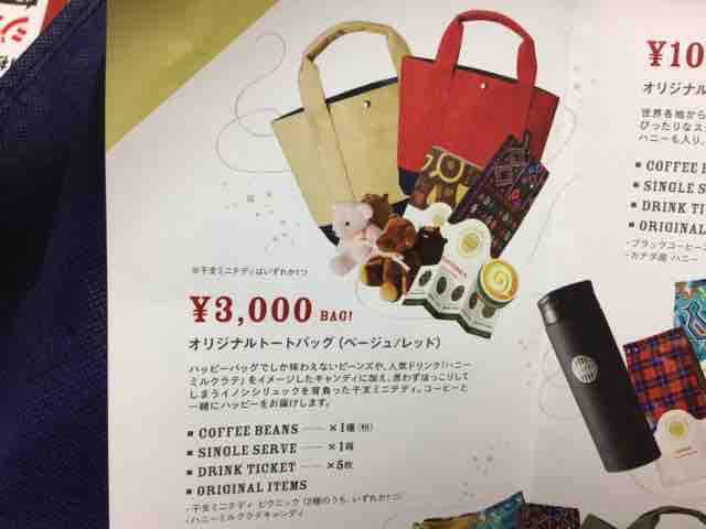 3,000円のハッピーバッグの中身は、オンワードとコラボしたオリジナルトートバッグ(ベージュorレッド)、グァテマラコーヒービーンズ180gの粉が1種、シングルサーブ4パック入りが1箱、ショートサイズの好きなドリンク1杯と交換できるドリンクチケットが5枚、オリジナルアイテムとして干支ミニテディピクニック2種のうちいずれか1つ(テディの色はピンク色と茶色、背負っているイノシシリュックは茶色と黒色)、ハニーミルクラテキャンディとなる。