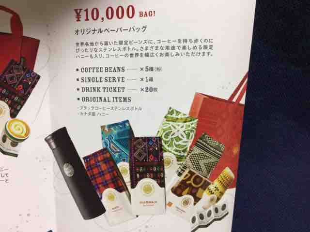 10,000円のハッピーバッグの中身は、赤色のオリジナルペーパーバッグ、グァテマラ/ホンジュラス/ケニア/ブラジルのコーヒービーンズ180gにエチオピアのコーヒービーンズ150gの粉が5種、シングルサーブ4パック入りが1箱、ショートサイズの好きなドリンク1杯と交換できるドリンクチケットが20枚、オリジナルアイテムとしてコーヒーを持ち歩くのにぴったりなステンレスボトル(容量:500ml)、カナダ産の限定ハニー(はちみつ)となる。