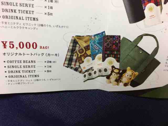 5,000円のハッピーバッグの中身は、オンワードとコラボしたオリジナルトートバッグ(カーキ)、グァテマラとホンジュラスのコーヒービーンズ180gの粉が2種、シングルサーブ4パック入りが1箱、ショートサイズの好きなドリンク1杯と交換できるドリンクチケットが8枚、オリジナルアイテムとして干支のかぶり物をしたミニテディ2種のうちいずれか1つ(テディの足の色が異なり、イノシシハットはベージュ色と黒色)、チェック柄ブランケット(サイズ:約600×900mm)となる。
