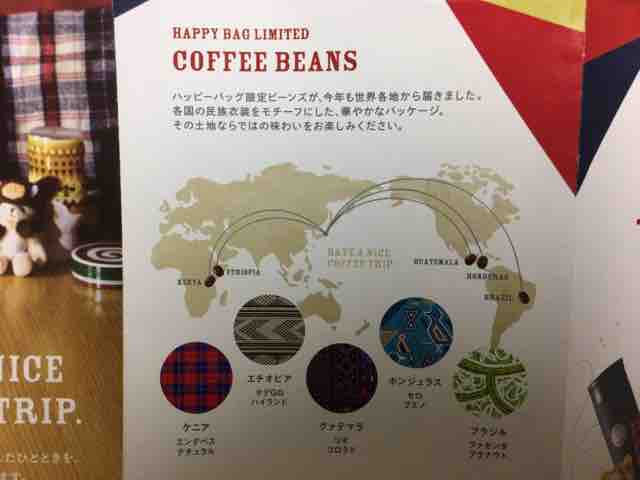 コーヒービーンズは、ハッピーバッグでしか味わえない限定品。限定品なので金額は分からないが、タリーズコーヒーのコーヒービーンズ180gの粉は1,000円以上はする。福袋の金額が高くなっていくと世界中のより多くの種類のコーヒービーンズが入る。パッケージは各国の民族衣装をモチーフにしている。