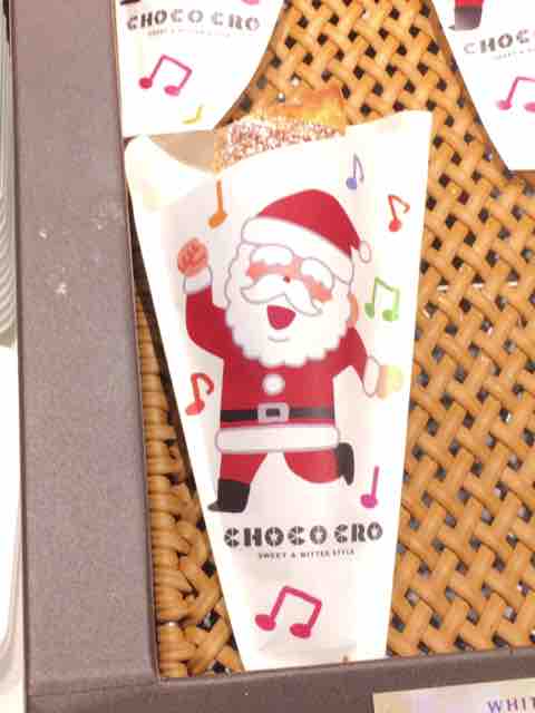 ホワイトチョコは製造工程においてココアバターからチョコレートの苦み成分であるカカオマスを除去するのが一般的。そこに砂糖やミルクを加えてあの白さと濃厚な甘みのチョコレートができる。美味しいホワイトチョコクロは、クリスマスまでの期間限定でサンタスリーブに包まれている。サンタクロースの絵はいくつかバージョンがあり、陽気にダンスしているイラストもある。クリスマスに向けて気分が盛り上がるイラストでかわいい。