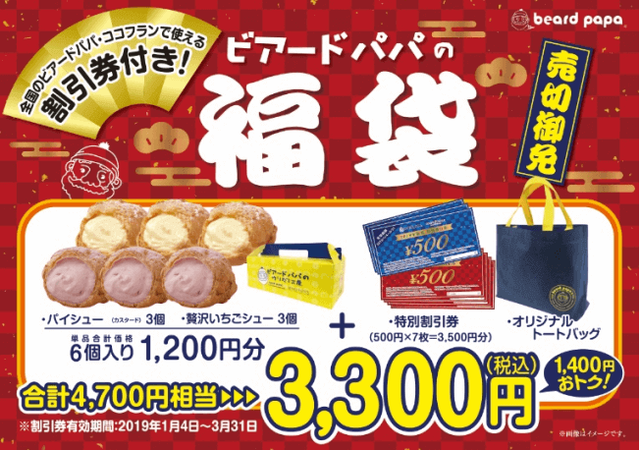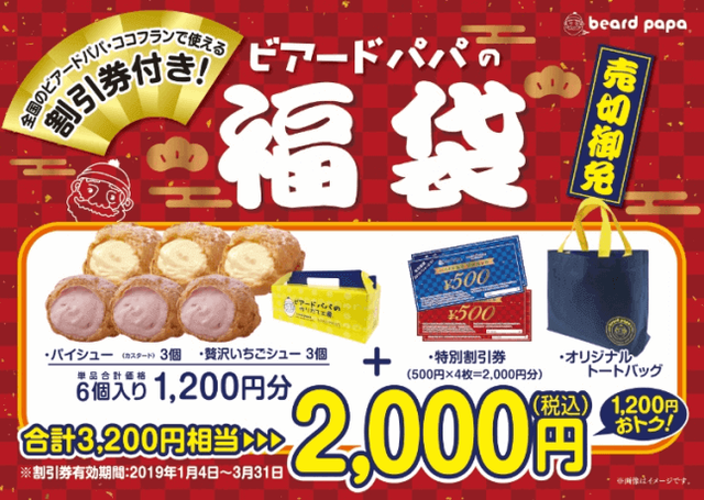 シュークリーム専門店のビアードパパから2019年福袋が数量限定で販売される。販売期間は2019年1月1日~となり、無くなり次第終了となる。店舗によって取り扱いがない場合もあるし、福袋の種類も店舗によって異なるため、次のリスト(4ページ以降)の2019年福袋販売店舗一覧から、お近くの店舗が福袋を取り扱っているか確認して欲しい。「2019年福袋販売店舗一覧」