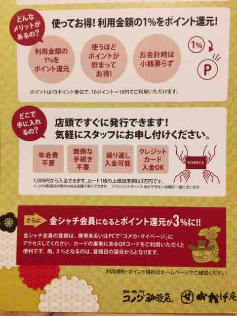 しかし、金シャチ会員になるとポイント還元が3倍の3%になる。金シャチ会員の登録はコメカのカード裏側にあるQRコードから空メールを送り、コメダクラブから送られてくるアドレスにアクセスし、会員番号、ニックネーム、生年月日、住所を登録すると金シャチ会員に登録が完了し、登録日の翌日から金シャチ会員として利用金額の3%がポイントとして還元されることになる。簡単な登録でポイント還元が3倍になるので、コメカを利用する方は金シャチ会員になることをおススメしたい。