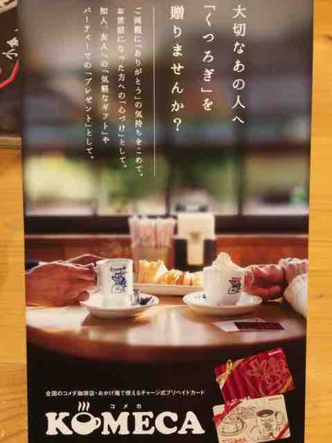 大切なあの人へ「くつろぎ」を贈りませんか?とコメダ珈琲店からコメカの利用を提案されている。コメカをプレゼントすることをくつろぎを贈ると言うあたりがコメダ珈琲店らしい。多くの人はコメダ珈琲店にくつろぎと安心してゆっくりした時間を過ごすことを求める。そのコメダ珈琲店で使えるコメカを贈ることは、くつろぎを贈ることと同じ意味を持つ。