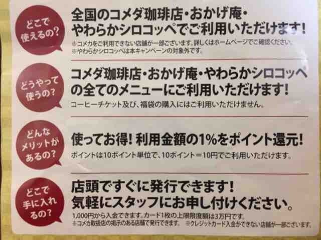 尚、コメカは店員さんに言えばすぐに発行してもらえる。コメカは1,000円から入金でき、カード1枚の上限限度額は3万円となる。コメカは全国のコメダ珈琲店、おかげ庵、やわらかシロコッペの全てのメニューに利用できるし、お釣りの受け渡しもなくスムーズな会計ができて便利だ。コーヒーチケットや福袋など現金購入のみ受付の一部商品には利用できないのでそこだけ注意となる。