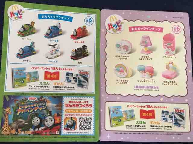 マクドナルドのハッピーセットに主人公トーマスなどの蒸気機関車のアニメで有名な「きかんしゃトーマス」とサンリオで長年愛されている「リトルツインスターズ」のおもちゃが登場している。