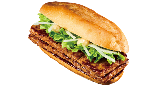 対象商品の3つ目は、ダブルリブサンドポーク。ジューシーなポークパティを2枚重ねにしている。更にレタスとスライスオニオン、ロッテリアオリジナルバーベキューソース、からししょうゆマヨネーズをソフトフランスパンで挟んでいる。からししょうゆがスパイシーでボリュームのある商品で、通常価格単品税込550円→税込500円の50円引きになる。