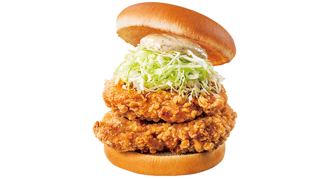 対象商品の2つ目は、ダブル黒こしょうマヨチキンバーガー。なんとフライドチキンパティをダブルにボリュームアップしている。フライドチキンは若鶏のもも肉を薄口醤油べースの生姜風味で味付けした竜田揚げ風。粗挽き黒こしょうのパンチが効いていて、マヨネーズを合わせたソースとキャベツを挟んで通常価格単品税込680円→税込600円の80円引きになる。