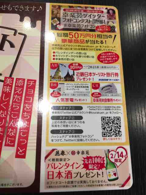 おっ、幸楽苑のTwitterキャンペーンは以前当選したこともあり、おススメしたい。2019年2月1日(金)~3月31日(日)までの期間で、総額100万円分相当の豪華賞品が当たる。Twitterで幸楽苑公式アカウントをフォローし、「バレンタインデーの思い出、ホワイトデーやひな祭りの思い出、幸楽苑の想思い出」にまつわる写真をつけ、ハッシュタグ"#幸楽苑フォトコン"をつけて投稿すると、応募ができる。ちなみに幸楽苑ホームページでは総額100万円分相当の豪華賞品とあるが、Twitterや店舗内の広告には総額50万円分相当となっている。