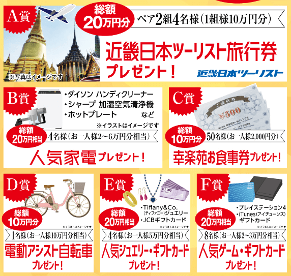 うーん、どちらの情報が正しいのか分からないが、100万円であると期待して、A賞は総額20万円分で近畿日本ツーリスト旅行券プレゼント。ペア2組4名様(1組様10万円分)となる。B賞は総額20万円分で人気家電プレゼントが4名様(お一人様2~6万円分相当)、C賞は総額10万円分で幸楽苑お食事券プレゼントが50名様(お一人様2,000円分)、D賞は総額10万円分で電動アシスト自転車プレゼントが1名、E賞は総額20万円分で人気ジュエリー・ギフトカードプレゼントが4名様(お一人様5万円分相当)、F賞は総額20万円分で人気ゲーム・ギフトカードプレゼントが8名様(お一人様2~3万円分相当)。どの賞も豪華なものばかりだ。