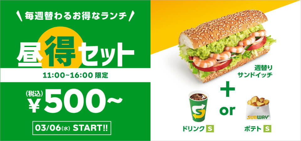 サンドイッチを主力商品としたファーストフード店のサブウェイで、ランチタイム限定でお得な価格で楽しめる「昼得セット」が2019年3月6日(水)より始まった。ランチはそれほどお金をかけずにお手軽価格で楽しみたいな、しかも手軽に野菜を食べたいなというニーズに応える形でサブウェイからランチ限定の嬉しいセットメニューが提案された。