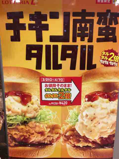 ハンバーガーチェーン店のロッテリアで、「チキン南蛮タルタルバーガー」が値段はそのままで特製タルタルソースが2倍に増量されているキャンペーンが実施されている。キャンペーン期間は、2019年3月21日(木)~4月7日(日)。