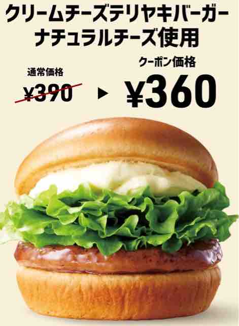 クリームチーズテリヤキバーガーは通常価格税込390円だが、モスバーガーのアプリやSmartNewsのクーポンを使用すると、30円引きの税込360円で購入できるので(2019年年3月29日時点)、少しお得になる。