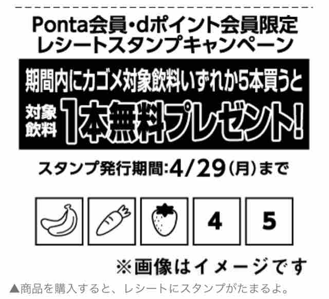 コンビニエンスストアのローソンで、カゴメ果汁・野菜飲料を累計5本(組み合わせは自由)買うと、対象の果汁・野菜飲料の中から1本と交換できる無料引換券レシートクーポンがプレゼントされる。