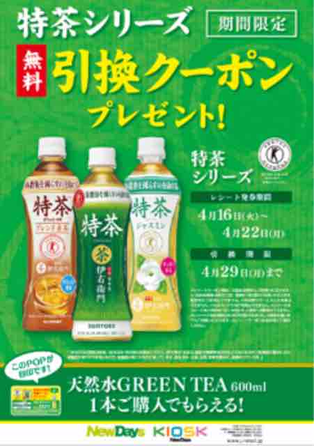 NewDaysで新商品のサントリー天然水GREENTEA600mlを1本買うと、特茶シリーズのサントリー特茶500ml、特茶500mlカフェインゼロブレンド麦茶、特茶500mlジャスミンのいずれかと交換できる無料引換レシートクーポンが発行される。レシート発券期間は、2019年4月16日(火)~4月22日(月)で、引換期間は2019年4月16日(火)~4月29日(月)となる。