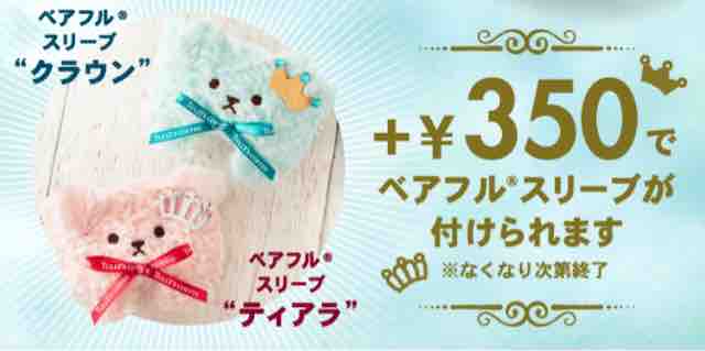 対象ドリンクとのセットで登場する2種類のベアフルスリーブ。ふわふわもこもこの可愛いスリーブ。春らしい鮮やかなミントブルーのカラーに王冠を被ったベアフルスリーブクラウン、キュートなパステルピンクにティアラを被せたベアフルスリーブティアラの2種類となる。数量限定となるため、無くなり次第終了となる。