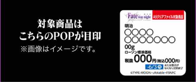 キャンペーン期間中に対象商品を2個購入すると、先着・数量限定でFate/stay nightのオリジナルA5クリアファイル全4種のうち、1枚がプレゼントされる。キャンペーン期間は2019年5/14(火)朝7:00~6月3日(月)となり、全国のローソンが対象となる。ナチュラルローソン、ローソンストア100は対象外。