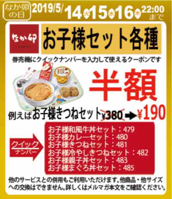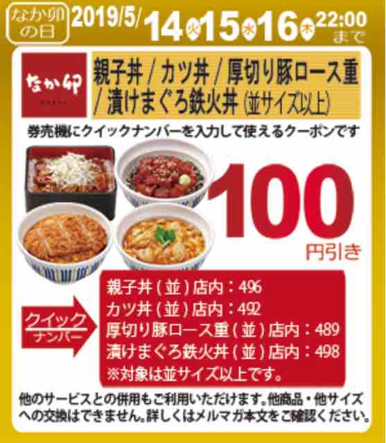 2019年5月「なか卯の日」店内利用のクーポン内容