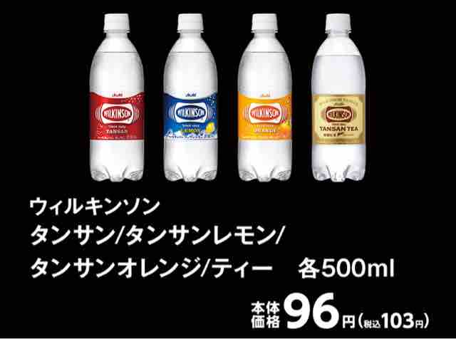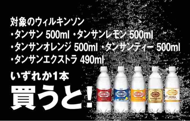 キャンペーン対象のウィルキンソンシリーズは、タンサン500ml、タンサンレモン500ml、タンサンオレンジ500ml、タンサンティー500ml、タンサンエクストラ490mlとなる。タンサンエクストラは税込108円、それ以外の対象のウィルキンソンは税込103円となる。