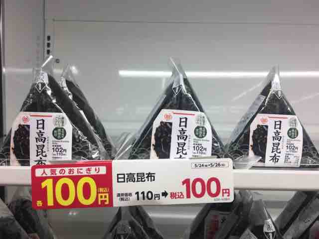 通常価格税込110円→税込100円。10円引き。ごはんと相性の良い昆布を味わえるおにぎり。