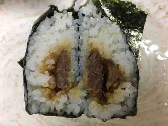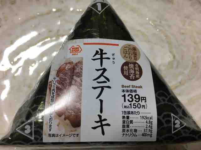 ん?牛ステーキ!なんと牛ステーキのおにぎりがあったか。この中で一番目を引くおにぎりだ。ツナマヨ、鮭、昆布、梅、これらは家庭でも用意できそうな具材だなという感じではあるが、牛ステーキはいきなり感がある。まさにいきなりステーキだ。あれ?どこかで聞いたような…牛ステーキのおにぎりをこの機会に味わってみるのもいいかなと思う。