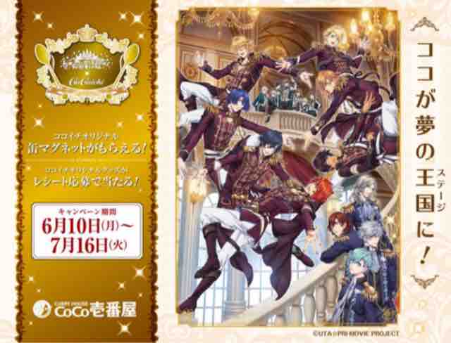 全国のココイチ(カレーハウスCoCo壱番屋)で、お一人様ご注文金額800円以上(税込)の会計で、「劇場版うたの☆プリンスさまっマジLOVEキングダム」の18名のメンバーが勢揃いしたココイチオリジナルデザインの缶マグネットが1個がもらえるキャンペーンが始まる。