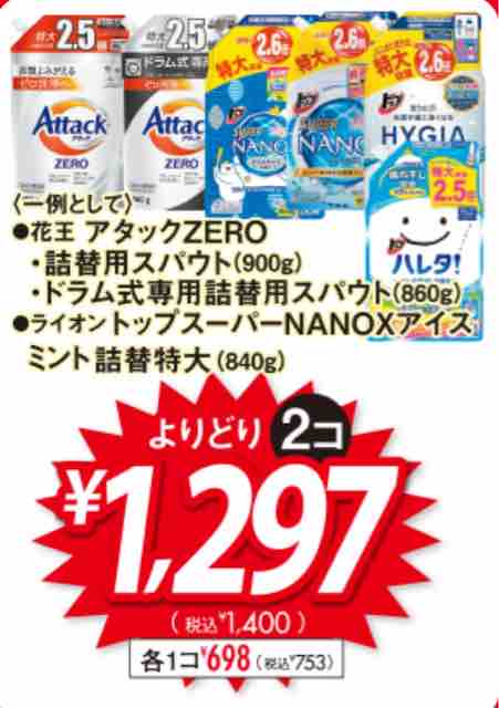 住まいの商品では、花王アタックZERO詰替用スパウト900g、ライオントップスーパーNANOXアイスミント詰替特大840gよりどり2個税込1,400円。洗剤は毎日の生活で必ず使うものだから、対象商品になっているのは嬉しい。