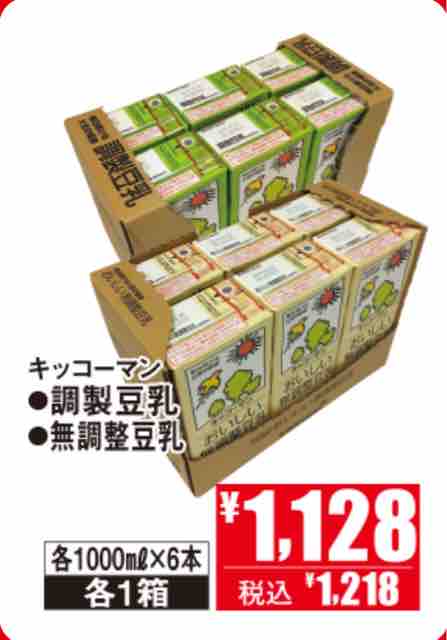 キッコーマン調整豆乳1000mlが6本1箱が税込1,218円。たんぱく質が摂れる。