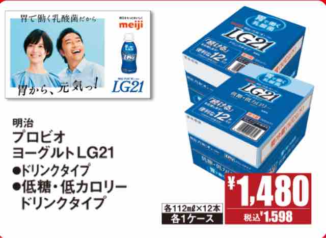 食料品だとドリンク各種ケース売り。明治プロビオヨーグルトLG21が12本入り1ケースで税込1,598円。胃で働く乳酸菌で毎日を元気に過ごすために、毎日続けて飲む方におススメ。
