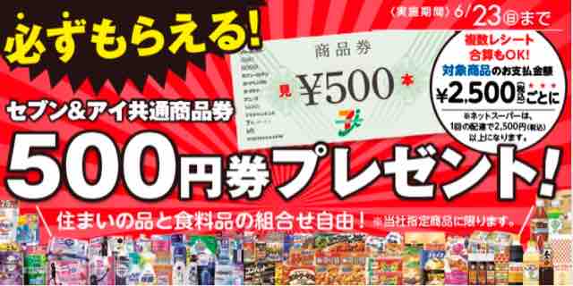 イトーヨーカドー指定の住まいの品・食料品などの商品を組み合わせ自由で、合計税込2,500円以上の買い物をすると、セブン&アイ共通商品券500円券が必ずもらえるお得なキャンペーンが実施されている。合計税込2,500円以上のレシートは、キャンペーン期間中の複数レシートを合算することができる。