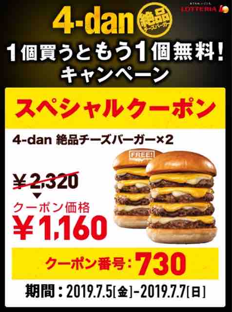 ・ロッテリアの4-dan絶品チーズバーガーを1個買うともう1個無料