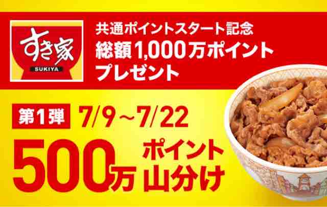 ゼンショーグループの牛丼チェーン店すき家で、共通ポイントサービス「楽天スーパーポイント」「Pontaポイント」「dポイント」が2019年7月上旬からスタートするのを記念して、第1弾、第2弾と分けてそれぞれ500万ポイント山分けキャンペーンを開催する。