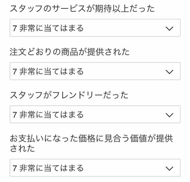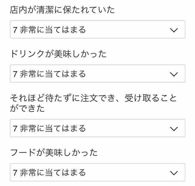 アンケートは8項目。7段階評価でスタバを利用した結果どのような評価し、最後に感想や評価の理由を書いてアンケートは終了となる。1は「非常に当てはまらない」、7は「非常に当てはまる」として評価する。アンケートは今後のスタバ運営に活用されると思われるため、正直な評価と感想を書くことが望まれる。