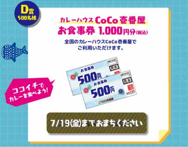 D賞は、カレーハウスCoCo壱番屋お食事券1,000円分が500名。