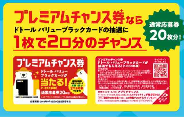 なんと通常応募券20枚分のプレミアムチャンス券が出ることもある。ドトールバリューブラックカードの抽選に1枚で2口分のチャンスとなる。